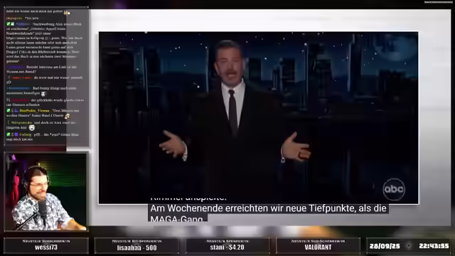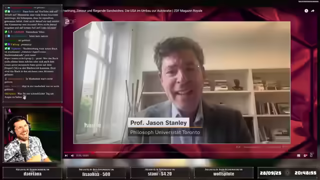 00:39:16Es wird ein Vergleich zwischen den Zuständen in den USA und Deutschland gezogen, wobei festgestellt wird, dass es in Deutschland zwar auch Grund zur Kritik gibt, die Situation aber nicht so schlimm ist wie in den USA. Dies diene als eine Art Coping-Mechanismus. Er erwähnt die Entwicklung eines eigenen Kartenspiels und sucht Unterstützung von Game Designern, die sich mit Spielmechaniken auskennen. Er berichtet von gescheiterten Verhandlungen mit Pegasus. Er kündigt an, im ZDF-Magazin Royale über die Situation in den USA zu sprechen und erwähnt, dass ein amerikanisches Late-Night-Studio nachgebaut wurde, um die US-amerikanischen Verhältnisse authentisch darzustellen. Er stellt fest, dass sich das Late-Night-Machtverhältnis zwischen Deutschland und den USA gedreht hat und dass deutsche Late-Night-Stars wie Stefan Raab nun Vorbilder für amerikanische Moderatoren sind. Er zitiert Jimmy Kimmel, der Stefan Raab eine Moderation seiner Sendung angeboten hat. Er kritisiert die Zustände in den USA und sagt, dass man aufhören müsse, vom Ende der US-Demokratie zu sprechen, da man diesen Punkt bereits überschritten habe. Er deutet einen weiteren krassen Move in den USA an, zu dem er bald ein Video machen möchte. Er kritisiert die Bezeichnung von Charlie Kirk als Rechtsextremen im ZDF-Magazin Royale und im Spiegel. Er thematisiert die Ermordung von Charlie Kirk und die Reaktionen darauf, einschließlich der Einstufung der Antifa als Terrorgruppe durch die US-Regierung. Er kritisiert dies als politische Willkür und vergleicht es mit Methoden auf dem Weg in Faschismus und Autokratie. Er erwähnt, dass Alex Jones nun ein Hitlerbärtchen trägt und dass Pete Hexeth Generäle und Admiräle zu sich beordert hat, was Spekulationen über einen möglichen Krieg auslöst.