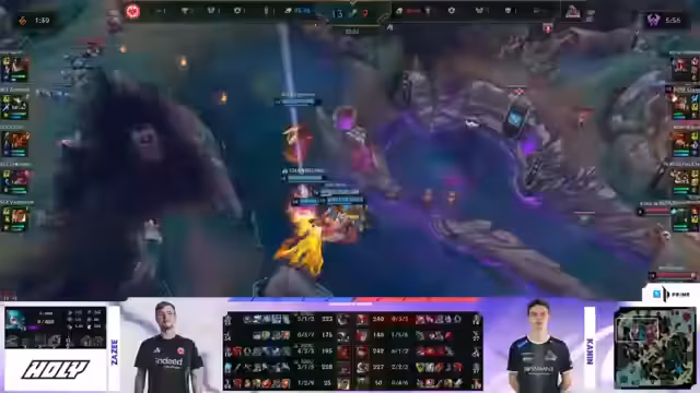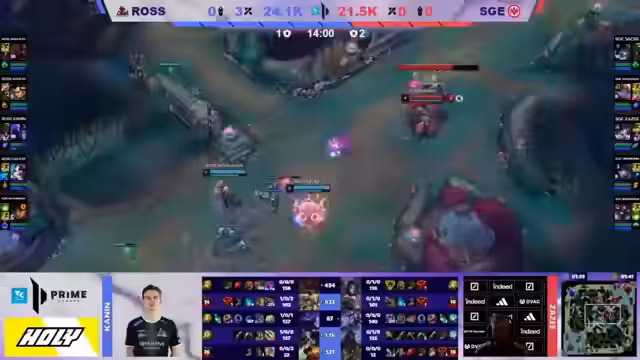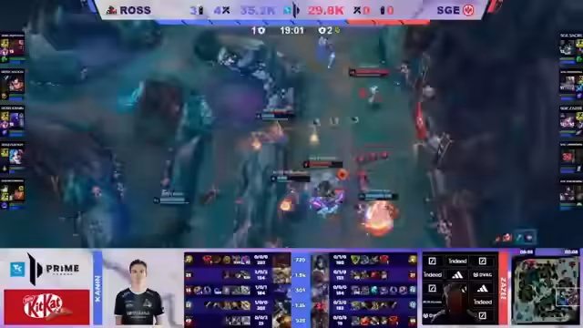 03:01:08Rossmann führt einen koordinierten Drachen-Raub durch und gewinnt den Kampf knapp. Dies gibt ihnen einen Goldvorteil von etwa 2.500 Gold nach 14 Minuten. Der Vorteil verteilt sich auf mehrere Positionen, wobei Funky mit seiner Jinx bereits über 1.000 Gold Vorsprung hat. Die SGE sieht sich mit dem Problem konfrontiert, dass sie keine Playmöglichkeiten mehr haben, während Rossmann das Spiel kontrolliert und Druck auf alle Lanes ausübt.