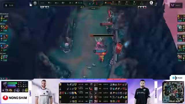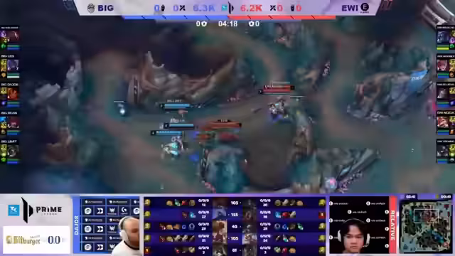 03:47:21Das Spiel zwischen EWI und BIG beginnt mit einer Lane-Swap, wobei der Jungle aktiv ins Geschehen eingreift. Afro Boy auf Smolder wird unter Druck gesetzt und muss früh sein TP ziehen. Roklo auf Shen taucht erfolgreich mit Hilfe seines Junglers den gegnerischen Toplaner, was ihm den ersten Kill und den 'First Blood' beschert. Der Jungle von Big kontrolliert frühzeitig den Bot-Side und die Top-Lane gerät unter Druck. Es wird deutlich, dass Jungle-Rotationen und early-Lane-Swaps eine entscheidende Rolle im Early-Game spielen.