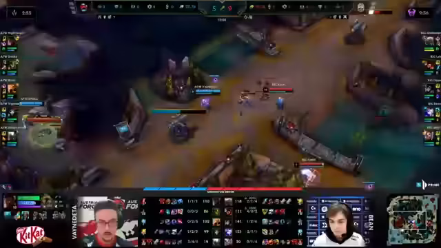 00:58:08Ein sehr spannender Start mit einem kleinen Trade auf der Toplane. Limit roamt und Wien sichert sich ein Cap. Hungry Ponder mit einem Double Knock-Up. Ein Desaster für Austrian Force Wilhelm, weil der Main-Carry weit zurückgefallen ist. Night Slayer hat sich entschieden, die Wave erstmal zu halten und hat einen relativ großen Lead. Der Ezreal muss einen Snowballing-Effekt erzielen, um gegen die Tanks relevant zu sein. Big spielt sehr diszipliniert und kann Vendetta killen. Big zollt Austrian Force Respekt, indem sie ein Standard 2v2 vermeiden. Night Slayer sollte einen Reset nehmen und den TP-Advantage in die Topside spielen. Dunker startet den ersten Drake. Big tradet mit den ersten drei Worldcrops. Shelfmade wird von Night Slayer geflasht und gekillt. Es ist ein blutiges Spiel mit fünf Kills in den ersten sieben Minuten. Jede Lane bekommt etwas ab. Der neue TP wird kritisiert, da er zu lange dauert.