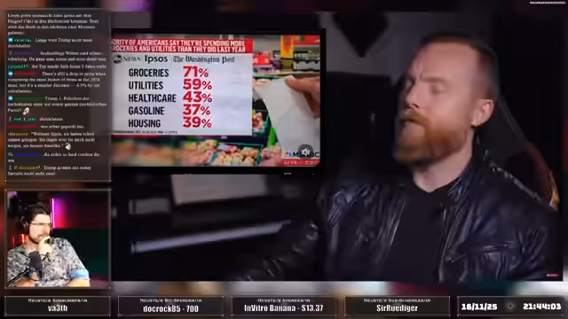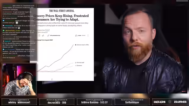 01:20:40Die Analyse vertieft sich in die sozioökonomischen Spaltungen der US-Gesellschaft. Während im Internet die Konfrontation zwischen politischen Lagern im Vordergrund steht, sieht der Streamer die eigentliche, tiefgreifendere Kluft zwischen einer rechen Oberschicht und einer arbeitenden Unterschicht, die Teil der amerikanischen DNA ist. Dies manifestiert sich insbesondere in der Wirtschaft, die für den normalen Bürger teurer wird, besonders in existenziellen Bereichen wie Lebensmittel, Wohnen und Gesundheitskosten, die durch Inflation und strategische Preiserhöhungen der Unternehmen weiter belastet werden.