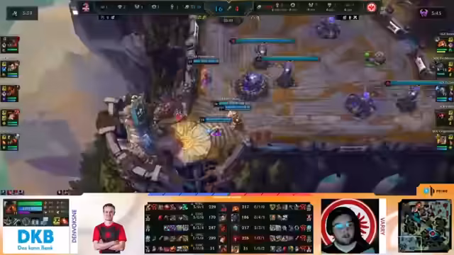 00:53:49Das Early Game zeigt ein klares Match-up zwischen den Teams. TOGs Bot-Lane mit Ivan und Braum übertrifft AFs Duo Vendetta und Minisupport. Smurf von TOG nimmt Danker von AF First Blood und kontrolliert das Spiel danach. Co-Moderator Kernus betont die Bedeutung der Bot-Lane-Kontrolle und wie TOGs Draft es ihnen ermöglichte, früh Initiative zu ergreifen. AF müsse jetzt aktiv werden oder riskiere, hinterherzuhängen. Die(Objectives) bleiben auf der Map sind dabei ein Schlüsselfaktor im Spielverlauf.