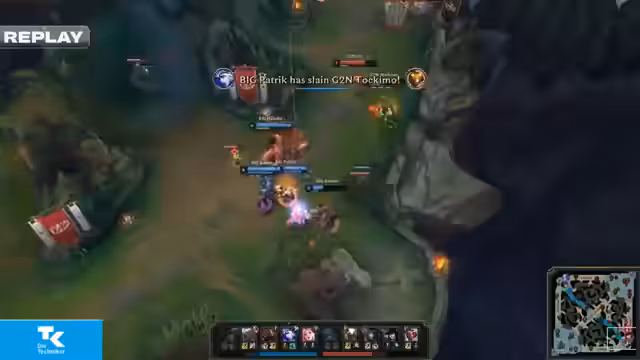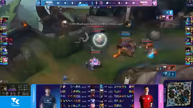 03:18:11Ein kritischer Teamfight beginnt mit einem aggressiven Play von Tokimo gegen Irrelevant, der zu einem Kill auf Rika führt. Dieser Fight, der sich an der Botlane entwickelt, markiert einen Wendepunkt, als G2 Nord den Gold-Lead von Big explodieren lässt. Das Team profitiert massiv, indem es Map-Kontrolle gewinnt und den ersten Map-Track sichert. Big, initial im Vorteil, kann den Overchase nicht stoppen und verliert durch den zeitigen Tod von Irrelevant die Initiative.