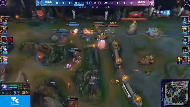 02:56:02Ein entscheidender Fight um den zweiten Drachen bringt die Wende im Spiel. Big setzt ein sehr riskantes Play, bei dem mehrere Spieler fallen, welches sich aber als profitabel erweist. G2 Nord kann trotz des Kills auf Rika den Drachen nicht contesten und Big gewinnt so die Kontrolle über wichtige Objektive. Der Goldvorteil wächst und die Power Spikes der Champions von Big beginnen wirksam zu werden.