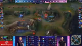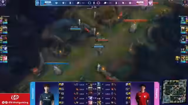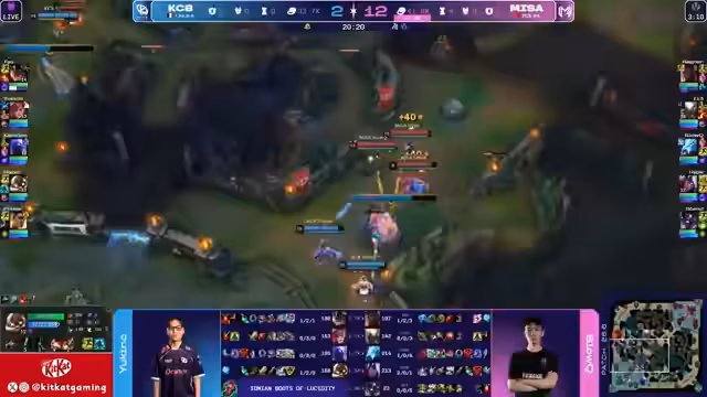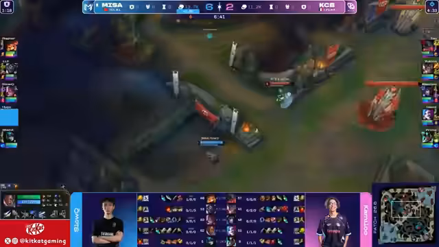 01:03:56Nach der Pause beginnt Game 2 mit einem klaren Rückstand für KCB. Ihr Draft, insbesondere die Wahl von Mundo und Lucian-Nami, entfaltet im Early-Game keine Wirkung. KCB verliert bereits in den ersten Minuten Kills und Map-Kontrolle an Misa, deren Spielstil aggressiv und dominant ist. Kommentatoren bemängeln, dass KCB auf ihrem gewohnten Niveau spielt und keine konstruktiven Änderungen vornimmt.