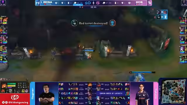 00:58:38Misa setzt früh den Druck auf KCB mit einer dominanten Laning-Phase. Durch aggressive Engages und ausgezeichnetes Positionsspiel, wie die Nutzung der Anivia-Wand von SlowQ, werden wichtige Kills für Tau und Prime erzwungen. KCB reagiert oft zu langsam, was zu Festnahmen und Goldvorteil für Misa führt, der sich bereits in den frühen Minuten aufbaut und den Grundstein für eine sichere Siegstellung legt.