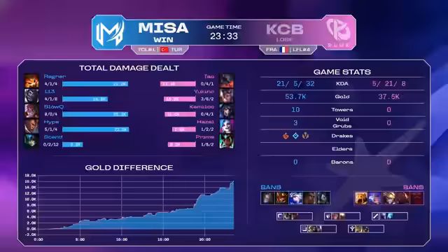 00:52:41Das erste Spiel endet mit einem deutlichen Sieg für Misa. Yukinos Performance im Early Game wurde als "Käse" bezeichnet, und KCB konnte sich vom starken Golddefizit nicht mehr erholen. Misa nutzte seinen Vorsprung, um alle wichtigen Objive zu kontrollieren und das Spiel zu seinen Gunsten zu entscheiden. Der Gewinner dieser Serie wird in der nächsten Woche gegen die Unicorns antreten, was bedeutet, dass es dann garantiert zwei Prime-League-Matches geben wird. Der Fokus verschiebt sich nun zum nächsten Spiel, BIG gegen G2 Nord.
