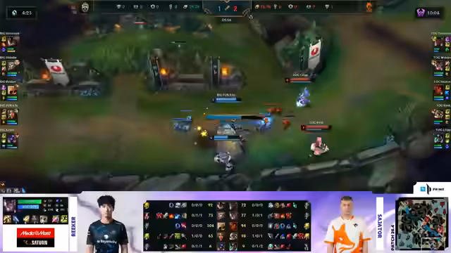 03:36:39Das Spiel beginnt mit einer spannenden Botlane-Phase. Team Orange Gaming setzt stark auf ihre Botlane-Prime-Kombination, während Big versuch, mit einem Re-Gang auf die Bot-Seite zu kontern. Ryu ist hier gefährlich low, doch die gute Positionierung und der Schaden seiner Mitspieler, insbesondere Funky, ermöglichen es ihm, sicher entkommen zu können. Funky erzwingt zudem durch einen schnellen Wave-Gee einen guten Backport, was dem Team weiteren Druck verleiht und die Wave kontrolliert.