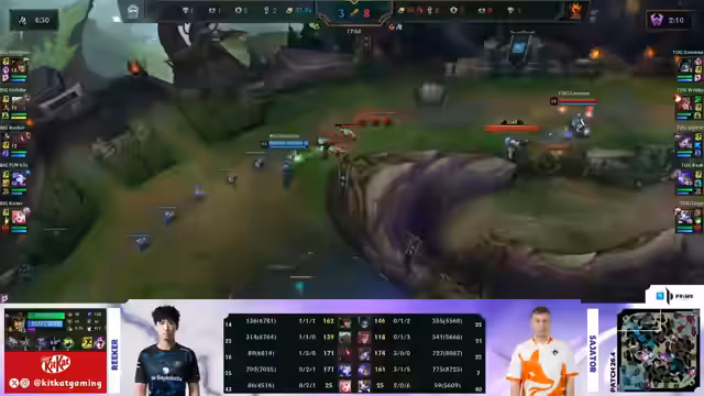 02:56:00Big hat einen 3 zu 2 Vorteil plus den Baron-Buff. Die goldene Führung von knapp 5000 Gold für Spandau wird hauptsächlich auf der Toplane generiert, da Ornn stark im Rückstand ist. Paul of Evil macht sich bemerkbar, doch Relative kann sich nicht positionieren. In der Midlane eskaliert das Spiel durch die Wave mit Baron-Buff, und der halbe Turret fällt. Der erste Inhibitor liegt frei.
