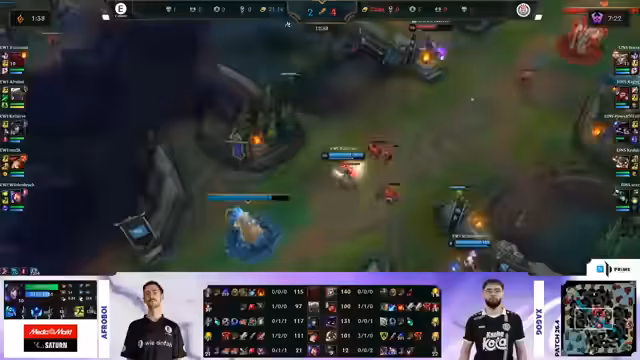 00:41:05Das Spiel beginnt mit einem aggressiven Fight auf der Bot-Lane, bei dem Afro Boy und Xargok in einen Kampf um die erste Krabbe verwickelt sind. Afro Boy stirbt, aber Xargok verliert dafür seinen Flash und viel Leben. Ewi erwirtschaftet sich einen leichten Vorteil durch die successful Invasion von Mundo. Es folgt ein Teamfight um den ersten Drachen, bei dem es einen engen Kampf gibt. Eintracht Spandau sichert sich letztendlich den ersten Drake und nimmt eine Gold- und Map-Kontrolle in Anspruch.