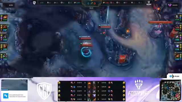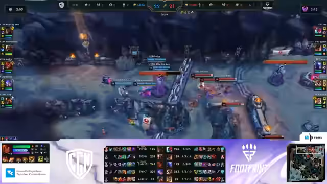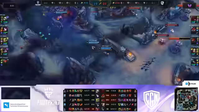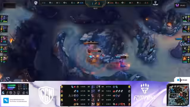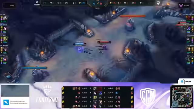 02:50:08Der Verlauf des Spiels bleibt extrem knapp und ausgeglichen. Nachdem Lupi auf der Top-Lane stirbt, verlieren Footprint Gaming einen Fight in der Mitte, da Koulibaly von CJN gezielt angegriffen und ausgespielt wird. Obwohl CJN danach minimal in Führung geht, ist der Goldunterschied mit etwa 500 Gold unbedeutend. Das Spiel wird von objektiven Zielen und den sich entwickelnden Fights bestimmt, bei denen Fußpositionen und Kontrolle den Ausschlag geben.