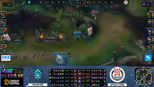 02:48:02Das Spiel verlagert sich ins Midgame. One-Man-Army, obwohl im Rückstand, kämpft sich zurück. Es kommt zu einem Teamfight um den dritten Drachen, bei dem Power of Evil einen Solo-Kill gegen Thalia holt und One-Man-Army mit 2-0 gewinnen kann. Sie nutzen den Momentum-Swing, um dem Spiel wieder eine Richtung zu geben. Das Geld steht weiterhin bei Eintracht Spandau, aber One-Man-Army zeigt Kampfgeist und findet zurück in das Spiel.