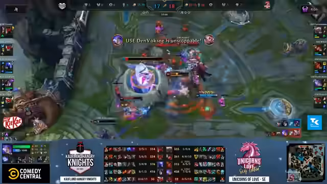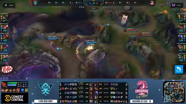04:46:07Das letzte Spiel zwischen One-Man-Army und den Unicorns verläuft zunächst für die Unicorns erfolgreich, die einen Goldvorsprung von 2000 aufbauen. Trotzdem können One-Man-Army das Spiel durch strategische Objective-Kontrolle und clevere Teamfights drehen. Ein entscheidender Kampf um den Baron Nashor wird von One-Man-Army gewonnen, was zu einem klaren Goldvorsprung führt. Das Team macht das Spiel final durch einen Ace und den anschließenden Einbruch in die Basis der Unicorns klar.