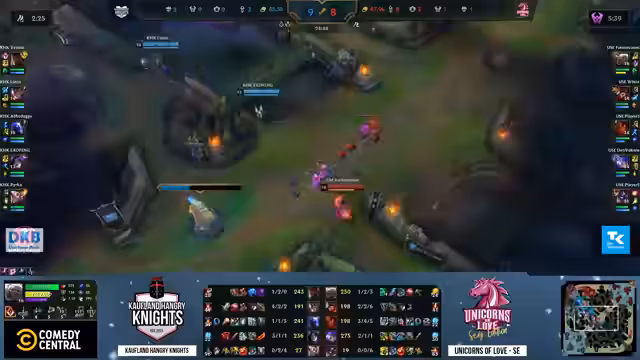 02:19:23Kaufheim steht unter enormem Druck und muss zwingend gewinnen, um im Turnier zu bleiben. Ein unkoordinierter Angriff der Unicorns führt zu einer Überzahl. Es kommt zu einem furiosen Teamfight, bei dem die Unicorns Kaufheim komplett dominieren. Sie holen sich einen Hidden Triple Kill und beenden das Spiel souverän. Der Sieg der Unicorns markiert einen Wendepunkt in der Gruppe B, da nun Favorit Kaufland mit 0-3 ausscheidet.