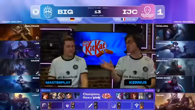 03:46:16Das Spielpendelt sich aus, nachdem BIG zunächst im Vorteil war. Das französische Team IJC findet zurück ins Spiel und gleicht die Drake-Situation aus. Die Kommentatoren beobachten, wie BIGs Engagement-Taktik mit Lab an Schwäche verliert, da IJC stark mit Skarner und Sertus kontern kann. Der Goldvorteil schmilzt, und das Spiel wird zum ernsthaften Kampf auf Augenhöhe.