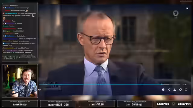 02:34:00Noch im Endspurt des Wahlkampfers wird Bundeskanzler Friedrich Merz in Duisburg erwartet. Der Streamer dokumentiert die angespannte Stimmung im Wahlkampf und die zunehmende Polarisierung der Gesellschaft. Am Duisburger Hafen treffen sich die Grünen zum Bier mit Banaschak, was die ernste, aber auch produktive Atmosphäre im politischen Diskurs zeigt. Die Dokumentation zeigt, wie die Parteien versuchen, mit den Ängsten der Menschen umzugehen, während gleichzeitig die Resignation wächst.
