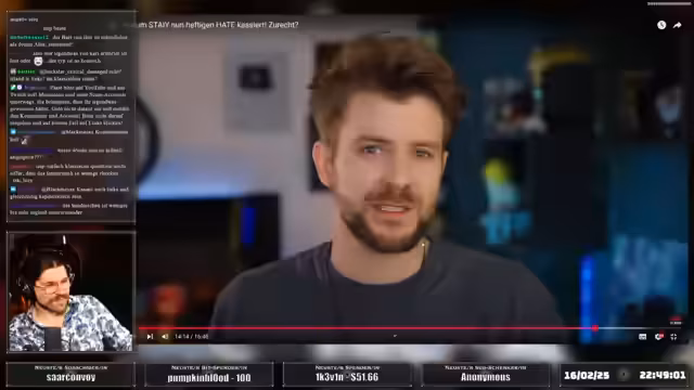 00:12:47Der Stream beginnt mit einer Entschuldigung für die Verspätung aufgrund technischer Schwierigkeiten. Es folgt die Ankündigung eines entspannten Streams mit Themen wie Krieg und Extremreichtum. Für den Folgetag wird die Teilnahme an einem Quadrell-Format der ARD angekündigt, was bedeutet, dass der Streamer dort anstelle des üblichen Kanals zu finden sein wird. Zudem wird auf die Veröffentlichung des zweiten Teils eines Videos am Donnerstag hingewiesen, welcher als noch "krasser" als der erste Teil beschrieben wird. Die Teilnahme an ARD Twitch-Streams ist nicht neu, da der Streamer bereits öfter zu Gast war, beispielsweise bei Mixed Talk. Morgen wird ein begleitetes Quadrell-Gucken stattfinden, mit Diskussionen vor und nach dem eigentlichen Format, bei dem auch Fragen an Frau Weidel und Robert Habeck gestellt werden.