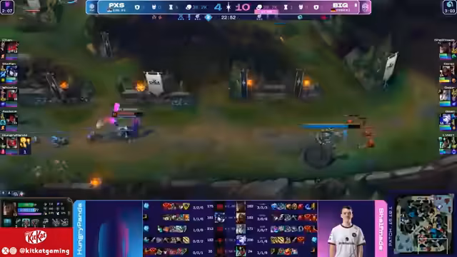 04:33:50Das Spiel nimmt eine interessante Wendung, als Dean einen entscheidenden Fehler macht und stirbt, was zu einem Tausch der Kills führt (1-1). Die Commentatoren analysieren die Item-Entwicklung der Spieler und bemerken, dass alle Spieler bald ihre ersten Items abschließen werden. Big wird als Team schneller spielen wollen und sucht nach Möglichkeiten, sich in das Spiel einzubringen. Es gibt Hinweise auf eine bevorstehende Pause und mögliche strategische Veränderungen im Spiel.