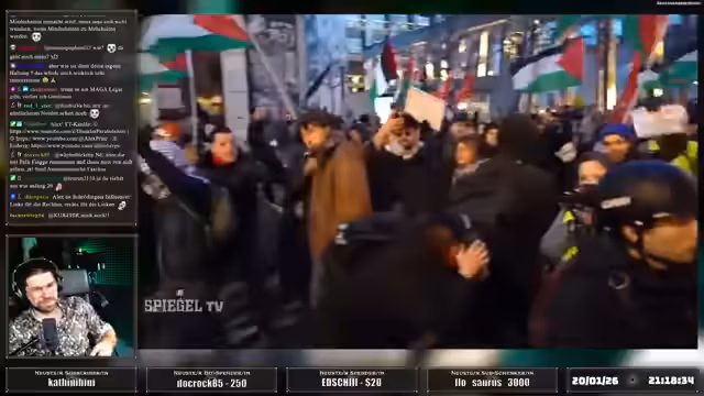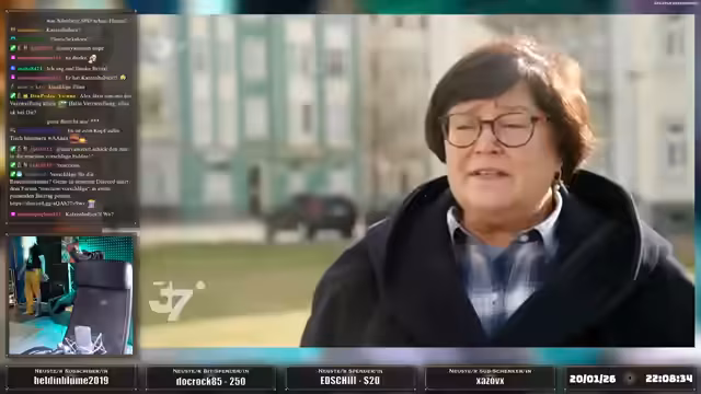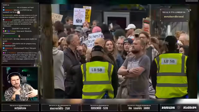 Moderator kündigt für Dienstag, 20. Januar 2026, einen politischen Stream an. Themenschwerpunkte sind Proteste in Großbritannien und Kritik an der Positionierung der FDP. Zudem wird ein Aufruf für ein Dokumentarprojekt ausgesprochen.