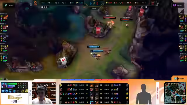 01:17:21Tog forciert die Entscheidung um den Baron, der vermeintlich das Ziel ist, aber auch nur der Bait sein könnte. Lucky landet einen schönen Hock, und 610 geht sofort in seinen Sonjas rein. Agurin versucht es noch einmal, aber 610 sichert sich einen Doppelkill. Tog sichert sich den Nash und damit die Vorentscheidung. Obwohl es kurzzeitig so aussieht, als könnte Dung Dynasty zurückkommen, reicht es nicht. Zendo versucht, den Nash irgendwie zu halten, aber die Minions nehmen die Base von Dung Dynasty auseinander. Tog lässt sich nicht beirren und nutzt den Smite-Vorteil und den Push-Vorteil in der Base. Es steht 18 zu viel, und es sind 15 Star Points auf Mid und 17 auf der Jungle-Position. Das Jungle-Midlane-Duo von Tog bietet eine wunderschöne Execution mit dem Draft und lässt von Anfang an nichts anbrennen. Sie spielen immer mit einem Lead, der mit dem Flash auf Level 1 begann. Sie versuchen, auf mehreren Waves gleichzeitig zu spielen, und bekommen alle In-Hips. Ein Turret steht noch vor dem Nexus, und es kommt zu einem gegenseitigen Abtasten. Dung Dynasty wird in ihrer eigenen Base gebullied. Phantasm wird angegangen, gecharmt und sofort down. Agurin gibt alles, um sein Team irgendwie drin zu behalten, aber es reicht nicht. Sixten spielt wieder ein Zu-Null-Game und ist Deathless. Tog sieht mittlerweile wie ein Top-3-Contender aus. Dung Dynasty hatte vermeintlich einen besseren Draft, aber Tog hat von Anfang an eine Match-Up gehabt, wo sie CS-Technik nach vorne kommen, und sie haben es kompromisslos durchgezogen. Es war ein harter Snowball, und das Team agierte sehr organisiert.