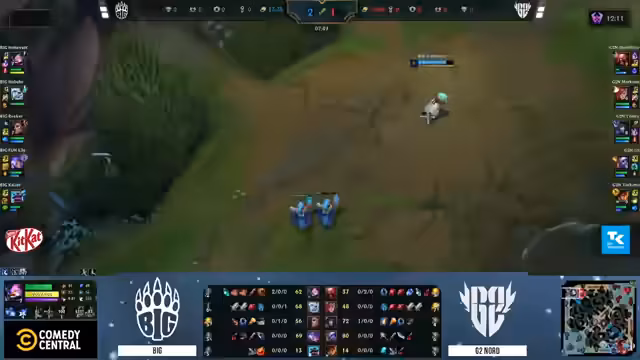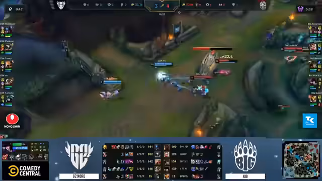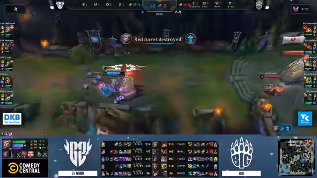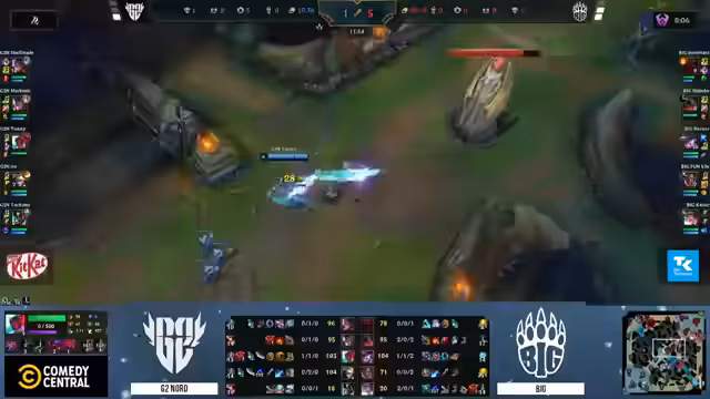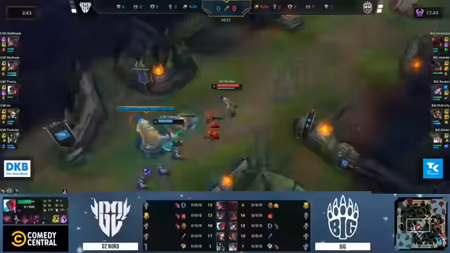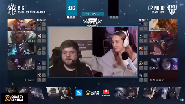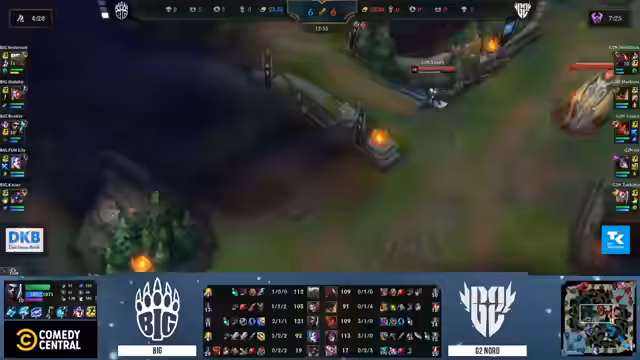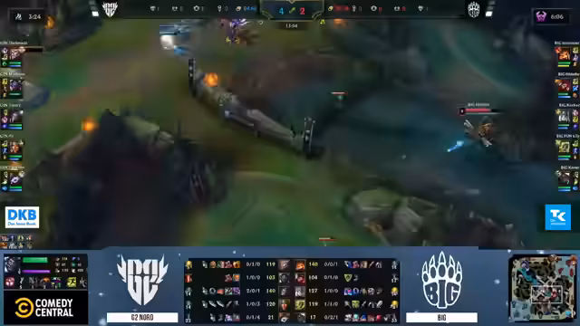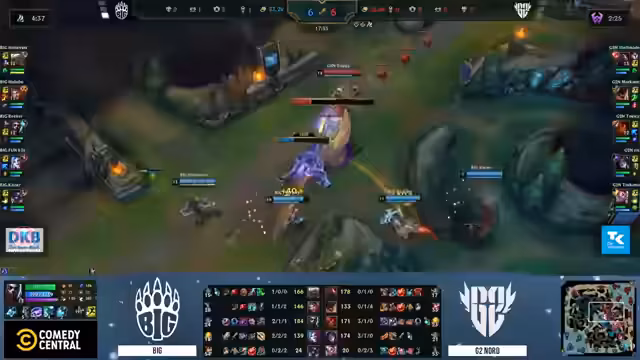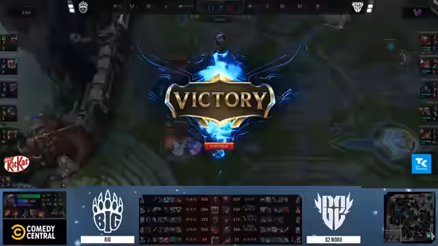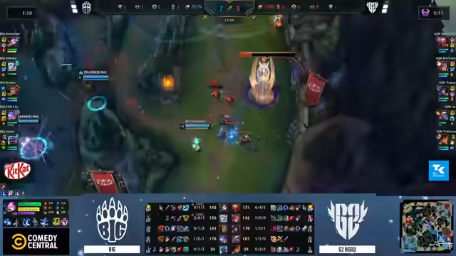 05:00:43Nachdem Big den Baron in Minute 24 durch eine kluge Falle mit Rikas Laser und Irrelevants Engage sichert, scheint das Spiel zugunsten von Big zu laufen. Doch G2 Nord, angeführt von Toasty, kann durch einen perfekt getimeten Einfall und einem Combo mit Marc Coon den AD Carry Bigs ausschalten. Trotzdem bleibt das Spiel auf Messers Schneide. In einem finalen, chaotischen Kampf um den Baron kann G2 Nord mit einem überzeugenden Teamfight das Spiel für sich entscheiden. Der Sieg wird durch ein sensationelles Ace gegen Big eingeleitet, was den ersten Titel im Comedy Central Snowdown für G2 Nord bedeutet.