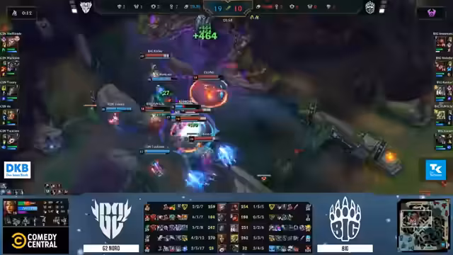 00:54:16Im entscheidenden Teamfight vor dem Nexus von G2 Nord feiert BIG einen klaren Ace. Funky spielt eine dominante Rolle und räumt gegnerische Spieler auf. G2 Nord kann dem Druck nicht standhalten und verliert das erste Spiel der Serie mit 0-2. Die Kommentatoren zeichnen das dominante und saubere Spiel von BIG nach, das das erste Spiel kontrolliert zu Ende brachte und die Erwartungen an die Series bereits nach Game 1 grundlegend veränderte.
