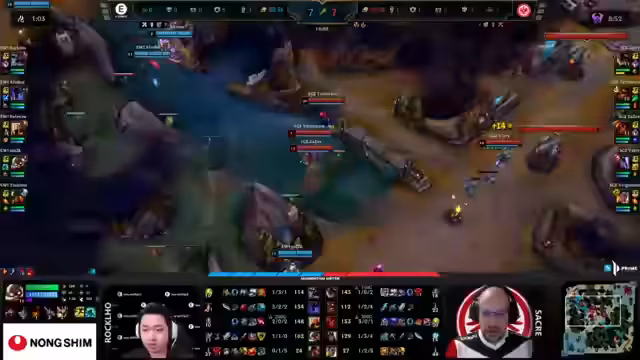 01:11:55Die frühe Spielphase zeigt ein ausgeglichenes Kräfteverhältnis zwischen EWI und SGE, wobei kleinere Goldvorteile für Frankfurt bestehen, die jedoch durch Teamfights jederzeit kippen können. Das Positioning der Spieler, insbesondere im Dschungel, wird als kritisch erachtet, da die verwinkelten Bereiche das Kämpfen erschweren. Taliyahs Fähigkeit, Wände zu errichten, beeinflusst die Teamfight-Dynamik zusätzlich. EWI sollte darauf achten, die Midlane zu pushen, um die Map besser kontrollieren und Vision aufzubauen, was durch Corkis geringere Anfälligkeit gegenüber Ganks unterstützt wird. Der Mythos, nach dem der Einsatz des Herolds in der Midlane die Mapkontrolle sichert, wird bestätigt, da er den Zugang zum Fluss erleichtert. Rokklo wird von Teiko-Teiko überrascht, kann aber seinen Flash nutzen, um zu entkommen, was Frankfurt den ersten Turm sichert. Afroboy kann den Vorteil des Nocturne-Ultimates nutzen, um Druck auszuüben, während EWI durch ein Cross-Mid-Play den Goldrückstand ausgleicht. Beide Teams agieren auf Augenhöhe, wobei Frankfurt Gefahr läuft, im späteren Spielverlauf unterlegen zu sein, aber noch die Möglichkeit hat, durch gewonnene Fights einen Schneeballeffekt auszulösen. Die ersten Pings in Richtung Topside River erfolgen, und Tokimo wird als Wachturm positioniert.