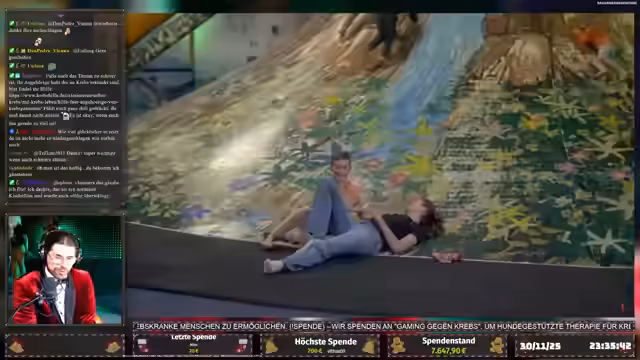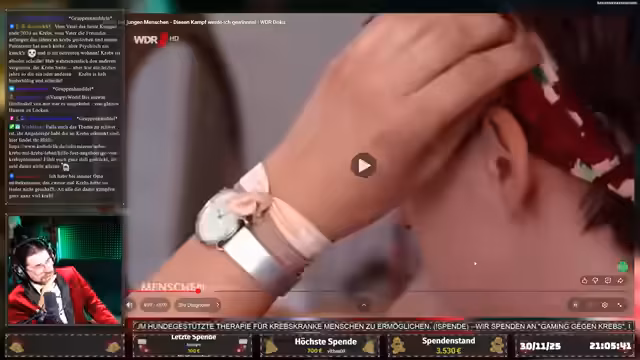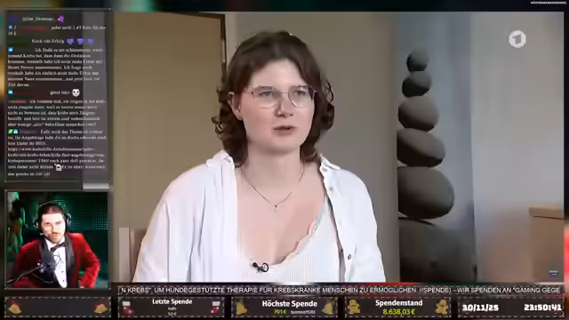 01:08:23Zum Abschluss stellt der Streamer Julian vor, der mit 24 Jahren an einer aggressiven Knochenkrebsform erkrankte. Nach anfänglicher Remission kehrte die Krankheit zwei Jahre später zurück. Er beschreibt seine tägliche Therapie, die Medikamente gegen Nebenwirkungen und den Kampf mit einer unter 50-prozentigen Überlebenschance. Seine Geschichte verdeutlicht, wie wichtig es ist, einen positiven Lebenswillen zu bewahren und wie die medizinische Betreuung zum festen Bestandteil seines Lebens geworden ist, ohne seine Perspektive zu verlieren.