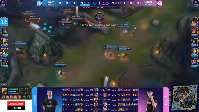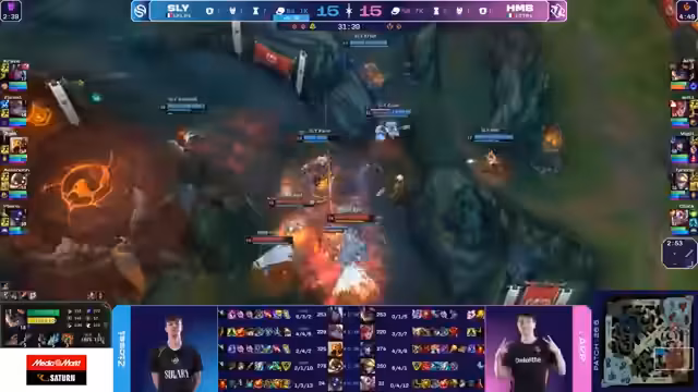 02:27:08Der entscheidende Wendepunkt tritt ein, als Humble in einem 5-gegen-5-Fight am Drachen scheitert. Obwohl Humble zuvor sogar in Führung lag und einige gute Fights gewann, gelingt es Solari, in diesem Teamkampf einen Clean Ace zu landen. Nach diesem Ace nutzt Solari die daraus resultierende Kontrolle über die Map, um einen Nashor zu sichern und den Goldvorsprung drastisch auszubauen. Dies markiert den Beginn eines unumkehrbaren Snowballs für das französische Team.