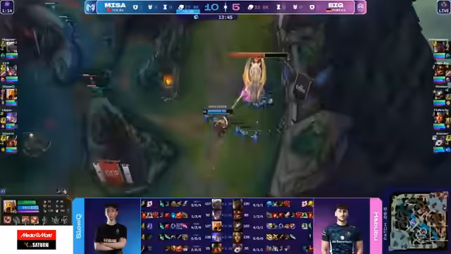 01:45:21Das Spiel endet in einem sehr ausgeglichenen Zustand mit gleichem Gold. Beide Teams bereiten sich auf einen finalen Teamfight vor. Der Fokus liegt auf der Kontrolle über das Nashor-Objektiv. Misa zwingt Big in einen Kampf, in dem beide Seiten viele Fähigkeiten einsetzen. Am Ende erleidet BIG aufgrund fehlender Flashes und schlechter Positionierung erhebliche Verluste, was den Sieg für Misa sichert. Das Match endet 0:2 für MISA.