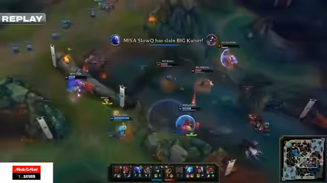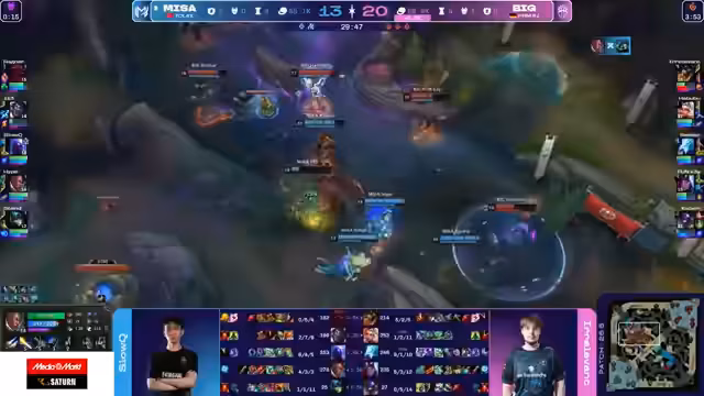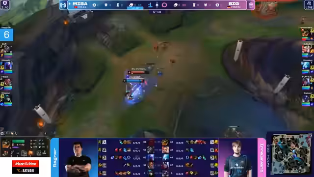 00:42:24Game 1 beginnt mit einem frühen Level-1-Gank von MISA, der jedoch nicht zu einem Kill führt. Im weiteren Verlauf macht MISA aggressives Map-Play und kontrolliert den Jungle. Kritische Fehler von Big führen zu einem frühen Goldvorteil für MISA. So stirbt der Jungle von Big, Habubu, bei einem Raptor-Invasion, und ein Teamfight im Mid-Game geht trotz numerischer Überlegenheit an MISA verloren. BIG kann dem Druck nicht standhalten und verliert das erste Spiel nach 23 Minuten mit einem klaren Golddefizit von über 12.000.