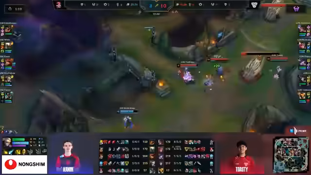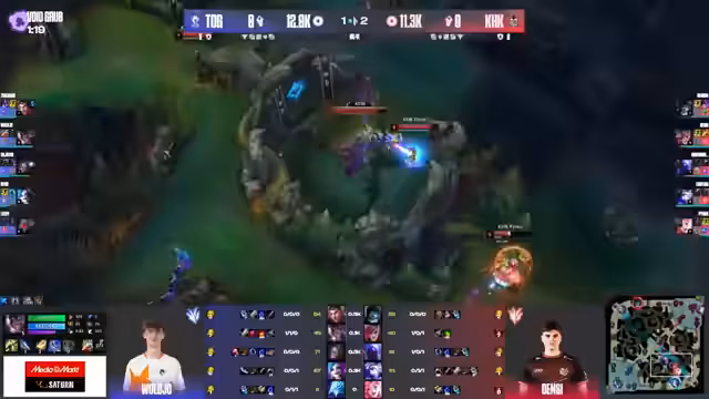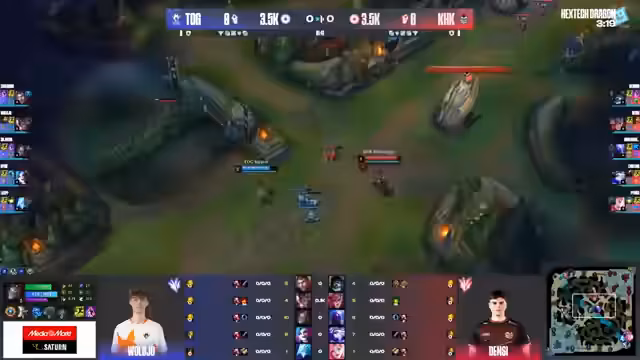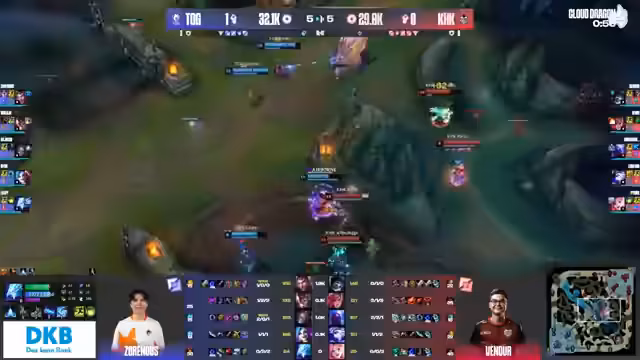 04:45:56Die ersten engen Teamfunde finden um die ersten und zweiten Drakes statt. Ein erfolgreicher Engage von Kaufland führt zu First Blood, doch Team Orange Gaming kontert effektiver und sichert sich den ersten Drake. Dies baut einen Goldvorteil für TOG auf, insbesondere durch die Kills auf der Bot-Lane, die der Jinx von Kaufland helfen, in das Spiel zu kommen. Der Fokus liegt auf der Dominanz von TOG in diesen initialen Auseinandersetzungen und der Schadensoutput ihrer Carries wie Jinx und Orianna.