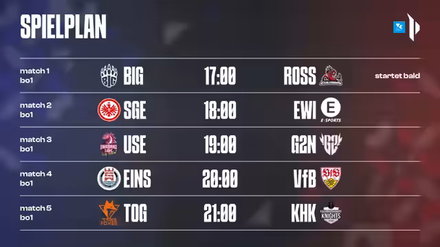 00:18:25Die Kommentatoren präsentieren die aktuelle Tabelle des vierten Spieltags. Der amtierende Champion BIG und Eintracht Spandau sind bisher ungeschlagen mit 3-0. Dahinter folgen Unicorns, EWI und G2 Nord mit 2-1. Am unteren Ende der Tabelle kämpfen Rossmann Centaurs und Kaufmann-Fengen United noch um ihren ersten Sieg der Saison. Der Start des heutigen Spieltags mit dem Duell Rossmann Centaurs gegen BIG wird als Krise für die Centaurs eingestuft.