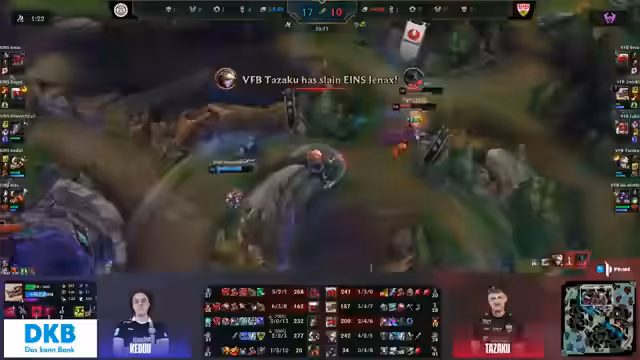 03:31:05Nach der Pause geht die TK Prime League ins vierte Game. Eine kurze Zwischenfazit zeigt, dass die Spiele bislang sehr knapp und unkonzentriertheitsbedingt entschieden wurden. Der Favorit hat in den meisten Fällen gewonnen. Nun steht das Match zwischen Eintracht Spandau und dem VfB auf dem Programm. Spandau gilt klarer Favorit, nicht zuletzt wegen der starken Midlane-Power von Power of Evil auf Orianna und dem potenten Draft mit Galio.