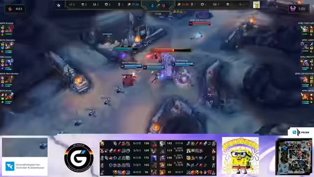 02:51:48Das Spiel wird zunehmend intensiver, mit wiederholten Fehlern von Spielern, die zu weit vorne stehen und gefangen werden. Ein Doppelstun von Indeed führt zu einem Doublekill für Akre, und Spongeburt gewinnt den Kampf, obwohl Kalem sich lange zur Wehr setzt. Spongeburt versucht, das Spiel unter Kontrolle zu bringen, doch 6GPA hält mit starkem Schaden dagegen. Trotz eines Reset von Atakan wird er gestunt und gefinisht, was zu einer Schlachtung führt, bei der Spongeburt nach knapp 20 Minuten meilenweit voraus ist und eine Goldführung von über 6.000 erreicht. Der vierte Drache spawnt, was Spongeburt eine Infernal Soul einbringen könnte, die 6GPA nicht contestet. Dies führt zu einer Free Infernal Soul für Spongeburt und verstärkt die Krise bei 6GPA. Ein Triple Kill für Akre unterstreicht die Dominanz von Spongeburt, dessen Silas fantastisch aufspielt und die Goldführung auf 9.000 bis 10.000 ausbaut. Trotz der hohen Führung bleibt die Möglichkeit eines Comebacks bestehen, ähnlich wie in Game 2, obwohl die Infernal Soul die Chancen für 6GPA weiter schmälert.