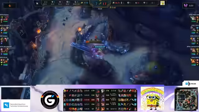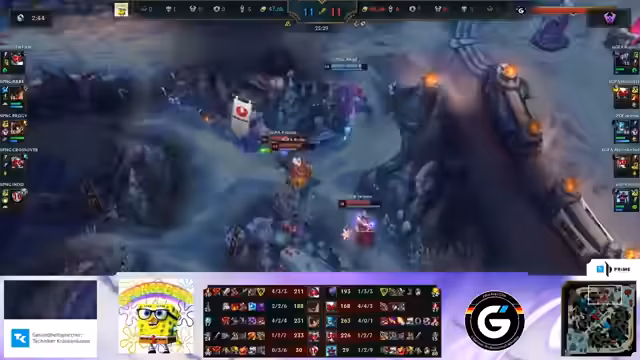 02:01:27Im späten Spielverlauf sind Crossover und Shepardt von Spongecourt ebenfalls auf vier Items und können mithalten. Kalem wird auf der Toplane alleine gelassen, wodurch Spongecourt einen weiteren Inhibitor-Turm erhält. Ivanan wird von Spongecourt gecatcht und stirbt, was zu einem weiteren Inhibitor-Verlust für 6GPA führt. Trotz eines Nashor-Buffs für 6GPA verlieren sie drei Inhibitoren, was die Verteidigung ihrer Basis erheblich erschwert. Ein unvorsichtiger Richu wird von Spongecourt im Busch gecatcht und stirbt, wodurch 6GPA in einem 4 gegen 5 Teamfight gerät. Der Elder Drake wird von 6GPA gesichert, nachdem sie Venter und Akre ausschalten konnten, was ihnen Soul und Elder Buff verleiht. Mit diesen Buffs und einer Überzahl versucht 6GPA, das Spiel zu beenden. In einem finalen Teamfight, in dem alle Spieler am Limit kämpfen, entscheidet der Elder Dragon Buff das Spiel zugunsten von 6GPA. Der Kommentator fasst zusammen, dass 6GPA das Spiel hätte einfacher gewinnen können, da sie zwischenzeitlich einen 9.000 Goldvorsprung hatten, aber Spongecourt durch gute Catches, den Nashor-Steal und makro-strategische Entscheidungen das Spiel extrem spannend gemacht hat.