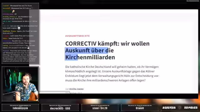 01:51:19Der Stream thematisierte den immosen Reichtum der katholischen und evangelischen Kirche in Deutschland. Die Untersuchungen zeigen, dass das Vermögen der Kirchen, einschließlich Immobilien und Wertpapiere, in die Milliarden-Beträge geht. Eine gigantische Dunkelziffer macht eine genaue Erfassung jedoch schwierig. Die Kirchen beziehen Einnahmen primär aus der Kirchensteuer und haben durch die Übernahme öffentlicher Aufgaben Privilegien erhalten.