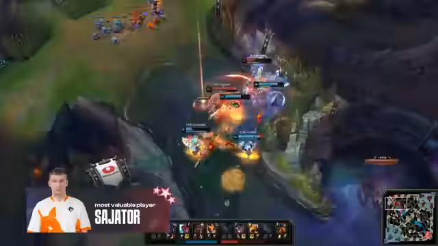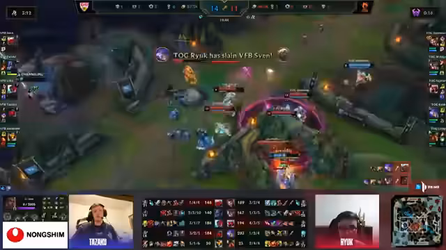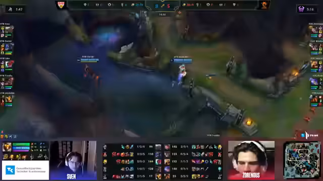 03:33:52Das Spiel wird durch anhaltende Kämpfe um Vision und Jungler-Objektive geprägt. TOG dominiert die Vision im Top-Side und erzwingt so den Fight um das Grub-Objekt. VfB muss trotz anfänglicher Rückschläge kämpfen, wobei Zwickl mit seinem Shen entscheidende Saves und Initiierungen für sein Team ermöglicht. VfB kann letztendlich die Grubs sichern.