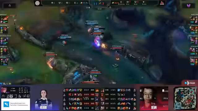 02:22:01Es gibt Spekulationen über das Spielverhalten der Spieler, ob Afroboy aggressiv spielen oder in alte Muster verfallen wird. Das Spiel beginnt sofort mit hohem Tempo, als Afroboy in den Enemy-Jungle eindringt und einen Reality Check erhält. Die erste Kill-Situation entsteht in der Top-Lane zwischen Chachi und CPM, wo Chachi das First Blood für sich entscheidet und das erste Statement setzt.