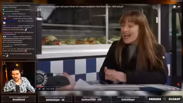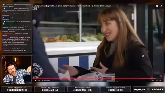 01:06:39Der Sprecher beobachtet eine aufkommende Bewegung bei der Linkspartei, da sich den Leuten offenbar bewusst wird, dass politische Entscheidungen oft gegen sie getroffen werden. Er führt den Hype auf die politischen Forderungen und die Person der Spitzenkandidatin Heidi Reichenegg zurück, die bis vor kurzem weitgehend unbekannt war. Um ihre Popularität zu untersuchen, wird ein Treffen mit ihr an einem Dönerstand vorgeschlagen. Die Moderatoren stellen sich als Robert Mayer und Florian Gregorczyk vor und erwähnen ihre Serie des WDR-Podcasts, in der sie Spitzenkandidaten vor der Bundestagswahl auf einen Döner treffen.