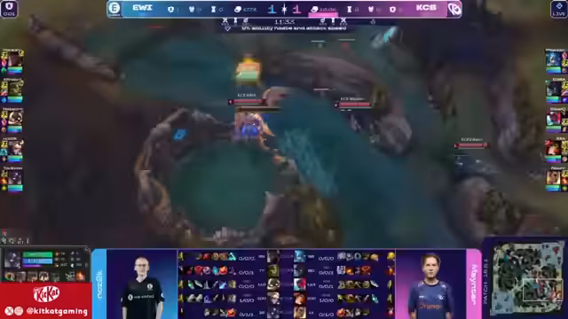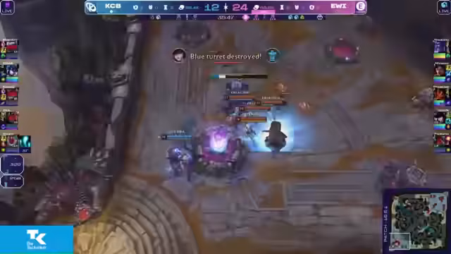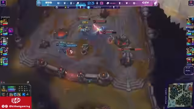 03:15:55Evi versucht, das Baron-Nashor zu sichern, aber findet sich in einer schwierigen Position wieder. Die Soul spawnet in 50 Sekunden und könnte eine Vorentscheidung bringen. KC Blue nutzt dies aus, um Gold mitzunehmen und Türme zu zerstören. Die 5-er-Gruppe von Evi in der Midlane kann die Sidelines nicht verteidigen, was zu Turmverlusten führt.