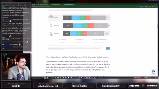 00:15:01Der Stream beginnt am Wahlsonntag mit einer hohen Wahlbeteiligung, die über der von 2021 liegt. Es wird betont, dass die Menschen die Dringlichkeit der Wahl erkannt haben. Es wird zu einer objektiven Analyse der Situation aufgerufen, um die Ängste zu mildern. Persönlich wird die Wahl als die bisher spannendste und aggressivste in Deutschland empfunden, begleitet von großer Unsicherheit in der Bevölkerung. Die Zeit der großen Volksparteien neigt sich dem Ende zu, während immer mehr kleine Interessenvertreter an Bedeutung gewinnen. Unabhängig vom Wahlausgang stehen schwierige Entscheidungen bevor, um das Land zukunftsfähig zu machen, wobei die Zukunft der Demokratie auf dem Spiel steht. Deutschland wird als zu langsam und unbeweglich kritisiert, insbesondere im Denken. Die Angriffe gegen politische Gegner sind normal geworden, wie das Beispiel von Merz zeigt, der gegen Grüne und Linke wetterte. Dies wird als schlechtes Signal für mögliche Koalitionsgespräche gewertet, da es die bürgerliche Mitte vor den Kopf stößt. Die Instrumentalisierung des Mordes an Lübcke und die Verbreitung von Lügen werden als absolut krank bezeichnet.