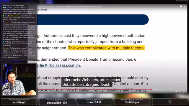 00:46:17Die Ermittlungen zum Attentat auf Charlie Kirk führen zur Festnahme des 22-jährigen Tyler Robinson, der nach eigener Aussage von Kirks "Hass" angetrieben wurde. Der Streamer diskutiert die Reaktionen aus der Politik, einschließlich der Warnung des Gouverneurs von Utah vor einem Wendepunkt für das Land. Er untersucht auch die Rolle der sozialen Medien bei der Politisierung der Gesellschaft und die wachsende Tendenz, politische Gegner als existentielle Bedrohung zu sehen.