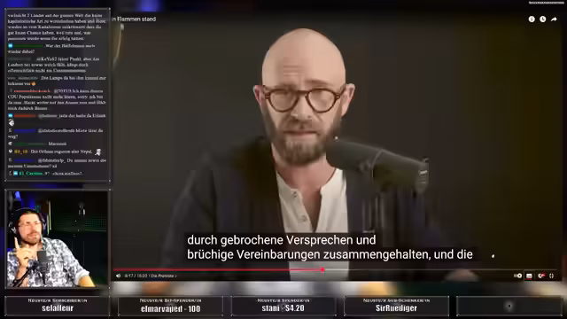 01:15:24Der Streamer äußert Verwirrung über die aktuelle Situation in den USA und bezweifelt Bürgerkriegsszenarien. Er stellt spekulative Fragen zur Gesundheit von Donald Trump und zieht Vergleiche zur Harry-Potter-Reihe, indem er von Horcruxen spricht. Es werden technische Probleme mit der Zeitanzeige erwähnt. Der Streamer empfiehlt das Buch 'Oststolz' und äußert sich zur deutschen Sprache als Amtssprache, was auf eine Diskussion über Migration und Rechtsextremismus hindeutet.