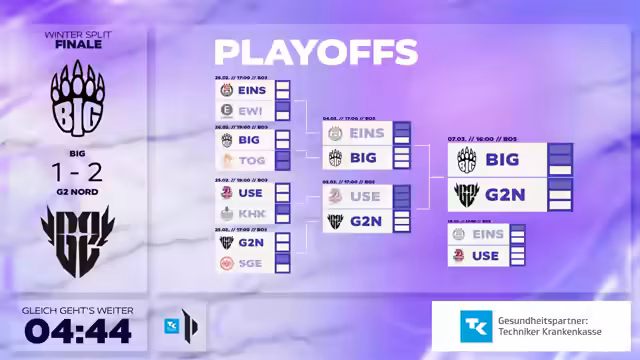 Nach einem intensiven Duell im Finale der TK Prime League Wintersplit wurde der Sieger bekannt. Das Team Big konnte sich im entscheidenden fünften Spiel gegen G2 Nord durchsetzen und sicherte sich damit den Titel des Wintersplit-Champions. Der gesamte Wettbewerb wurde live im Experion in Berlin ausgetragen und bot den Zuschauern ein hochklassiges Spektakel.