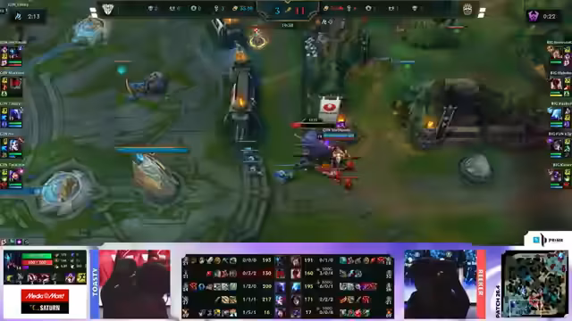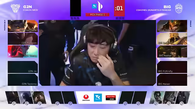 03:17:04Im ersten Game der Finalserie dominiert das Team Big nach einer anderthalbstündigen Pause. Der Draft von Big wird als sehr stark eingestuft und von Beginn an exzellent umgesetzt. Spieler von G2 Nord wirken nach der langen Wartezeit und dem unkoordinierten Start des Spiels mental angeschlagen. Die anfänglichen Versuche von G2 Nord, auf der Map Akzente zu setzen, scheitern kläglich. Analysten sehen den Grund für die deutliche Niederlage von G2 zu 70 % im Draft und nur zu 30 % in der spielerischen Ausführung. Für G2 Nord ist es entscheidend, im nächsten Game mental neu zu starten und Drafts zu wählen, in denen sich die Spieler wohlfühlen und aggressiv agieren können.