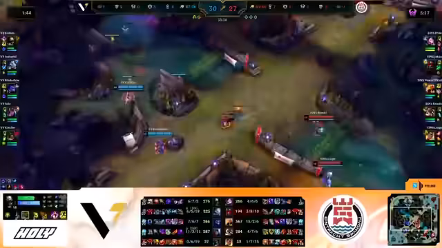 02:30:34Bladeshow sichert sich den Kill. Power of Evil wird gehuckt und es gibt eine Ultimate. Raudeville sorgt für den Kill von Bladeshow, während sein Team auf der Weakzeit den Drake contestet. Sola kämpft 1 gegen 2 gegen Power of Evil. Team Mentality gleicht zum 1:1 aus. V9 hält sich halbwegs im Spiel, trotz eines großen CS-Unterschieds im Jungle. Joker kommt dazu und will den Lipp verprügeln, wird aber geflasht. Er fightet weiter gegen Power of Evil und forciert sogar noch die Flash-Ult von Joker. Pride wird gecatcht und Bladeshow kann bursten. Powerfield nimmt den Botland-Turm. Lilith stirbt in der Mitte, was für den Midlane-Turm reichen sollte. Joker wird angegangen und stirbt durch die Flash-Ult von Blade Show. V9 ist in Kills vorne.