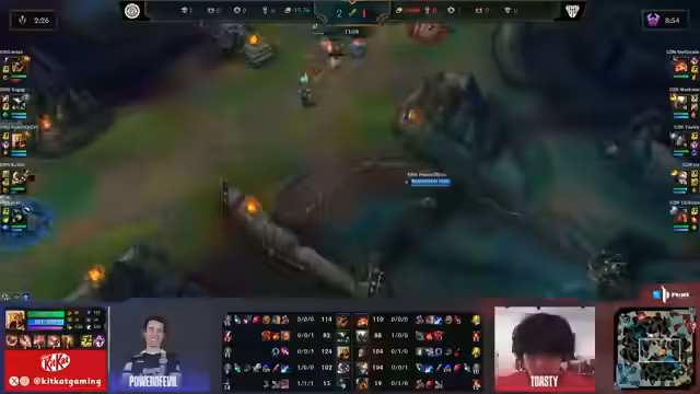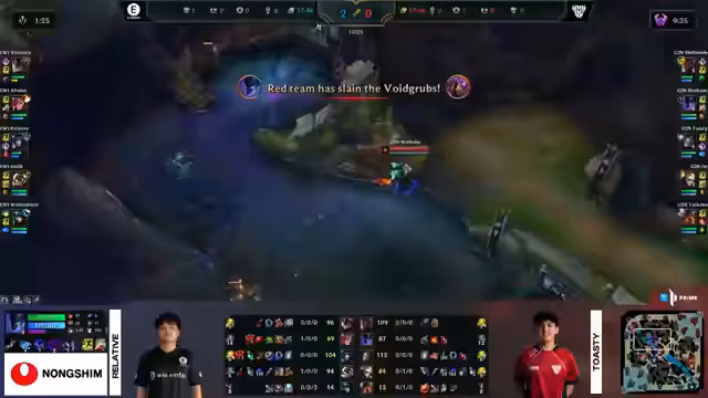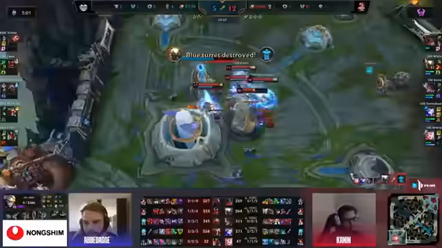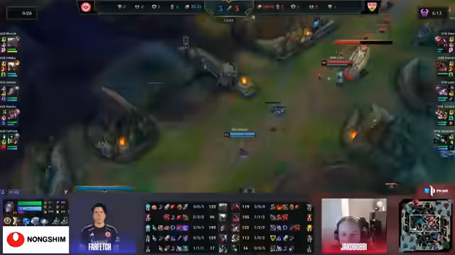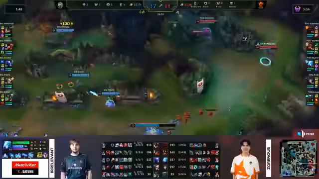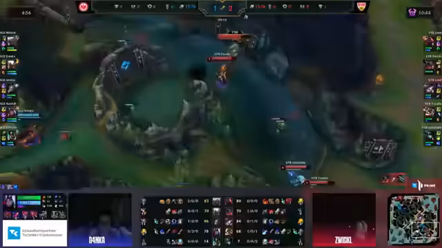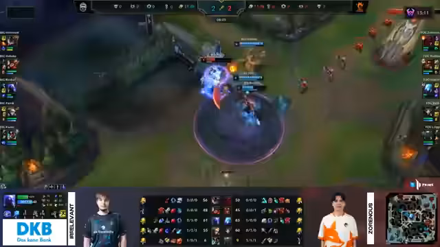 01:45:02Ein chaotisches Spielbeginn in der Top-Lane zwischen Habubu und Sayator führt zu einem Double Kill für Irrelevant. Der Jungle-Big nutzt kreativ eine günstige Situation, in der Sarator und Habubu ihre Ressourcen verbraucht haben. Big schlägt von der Mitte aus zu, eliminiert beide Gegner und dreht so ein anfänglich schlechtes Early Game für sein Team in einen Vorteil um. Innerhalb der ersten zehn Minuten ereignen sich neun Kills, was auf ein sehr wütendes und unkontrolliertes Spiel hindeutet.