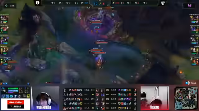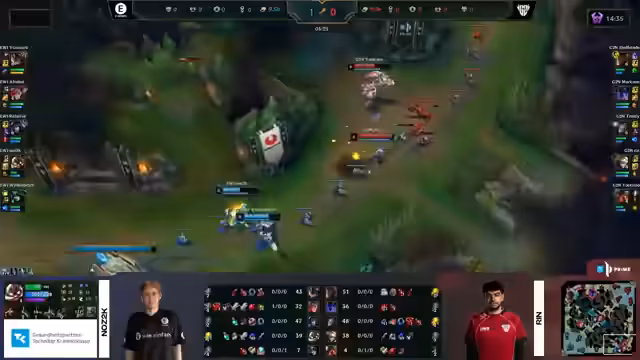 00:41:18Das Spiel beginnt mit einem Fokus auf die Jungler Makun und Oxago, die beide in den frühen Minuten ihre Roaming-Möglichkeiten testen. Es kommt zu einigen kleinen Scharmützeln, bleibt aber weitgehend ereignislos. Der erste Kill geht auf der Bot-Lane an Eintracht Spandau, bevor Makun dies für G2 Nord ausgleichen kann. Erwähnt werden die starken individualen Fähigkeiten der Spieler, insbesondere Shelfmade auf Top, der als einer der jüngsten Talente in der Liga gilt und eine hohe Final-Winning-Quote aufweist.