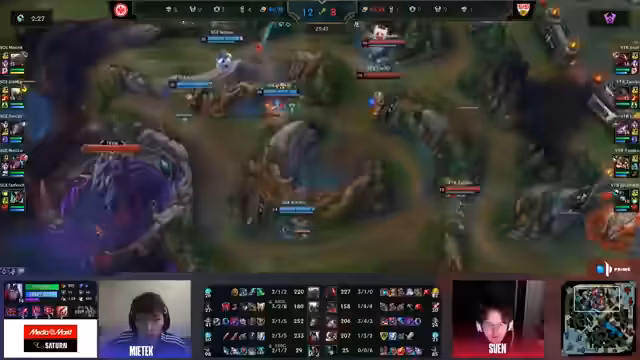 04:12:13Die finalen Kämpfe sind für VfB hoffnungslos. SGE greift koordiniert in der Base an, wo Luke sich in einer verzweifelten CC-Kette zeigt. Mitek und Sencox reinigen die Backline und sorgen für einen Ace gegen VfB. Mit dem Baron Buff und einer Golddifferenz von 7000 Gold ist der Sieg für SGE nicht mehr gefährdet und sichert ihnen den ersten Sieg im Spring Split.